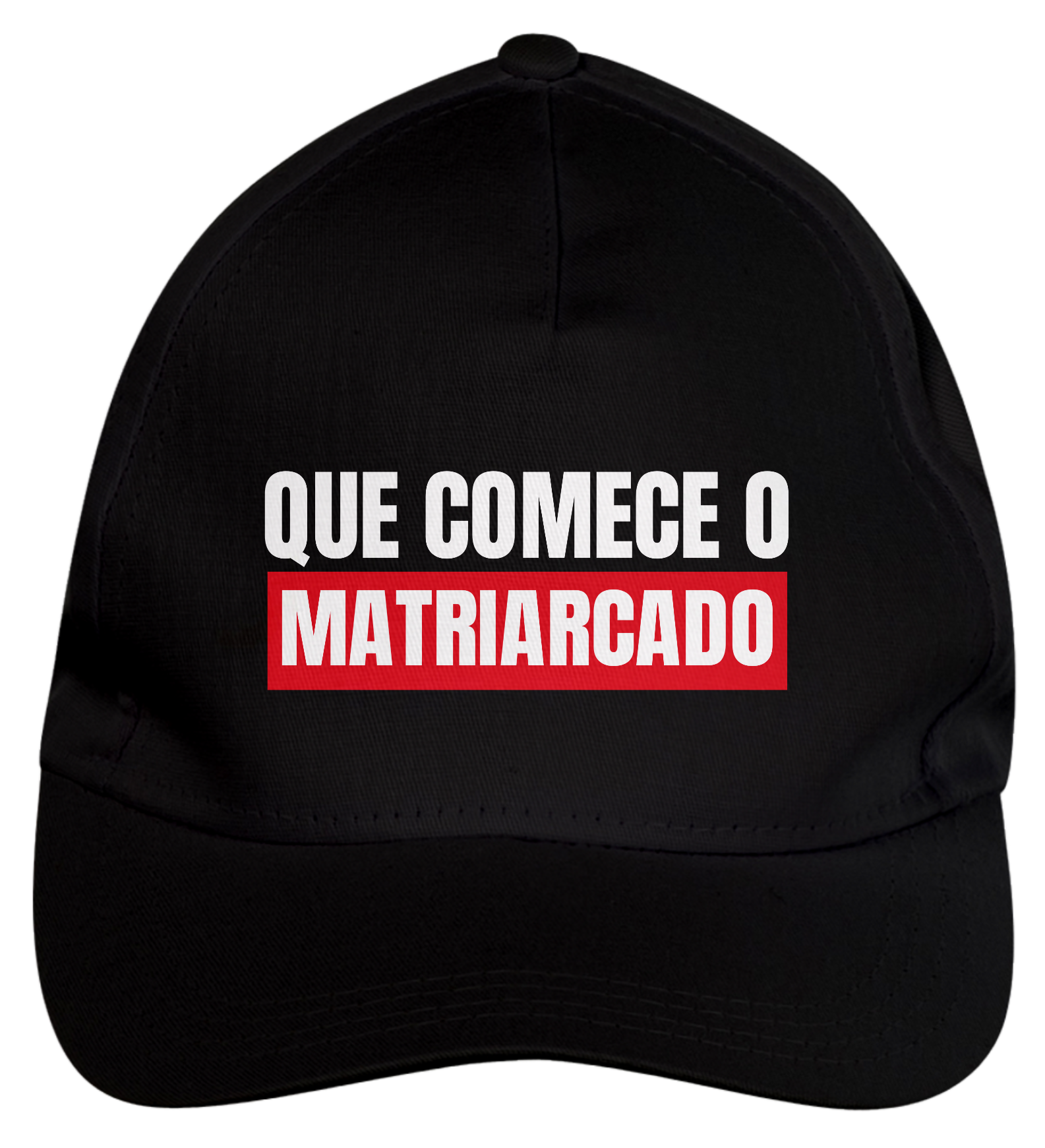 Boné americano com transfer frontal em alta qualidade, aba curva e fecho em tira totalmente regulável com pinos. O modelo veste tamanho "único".